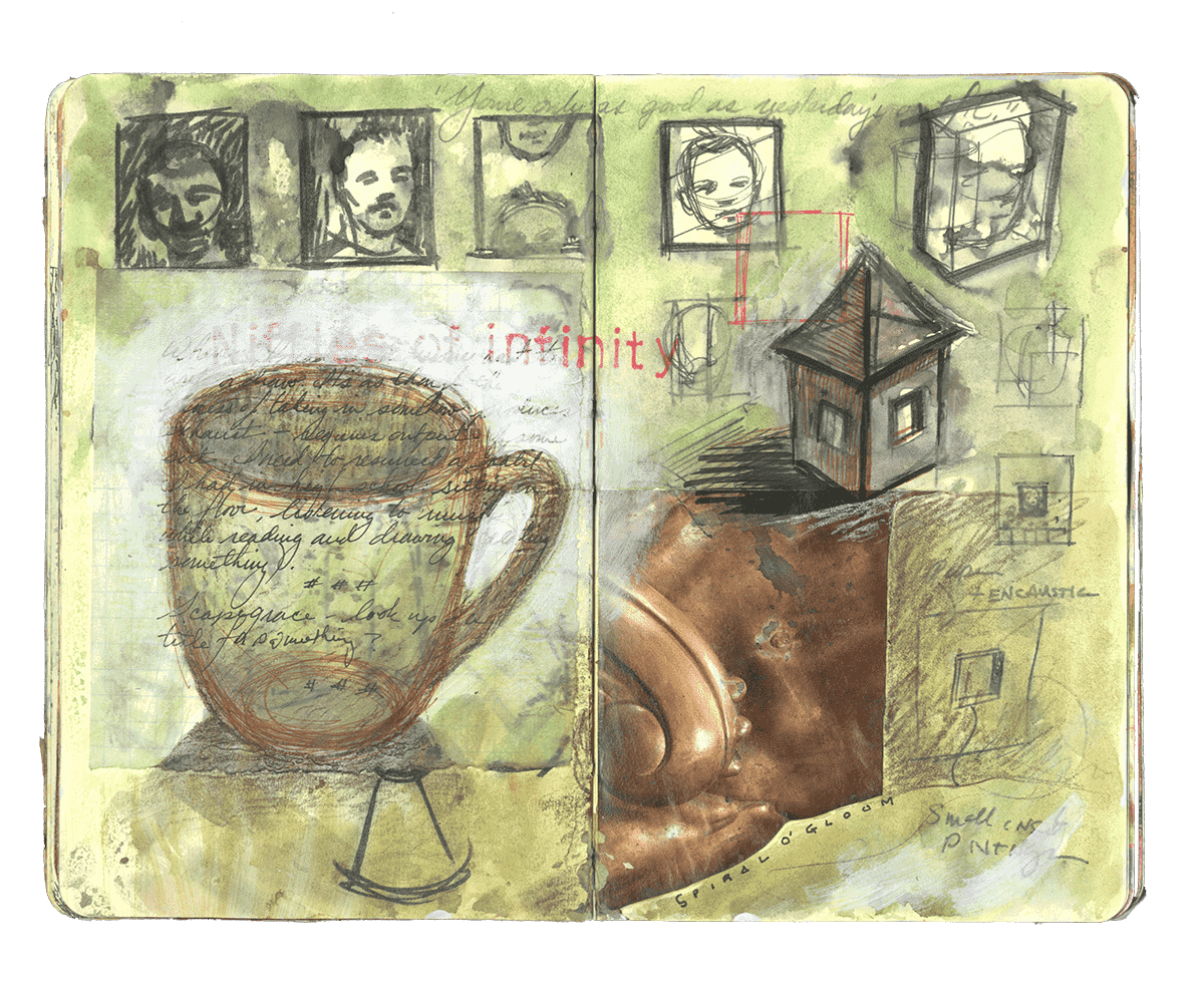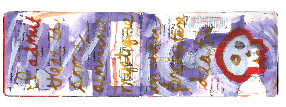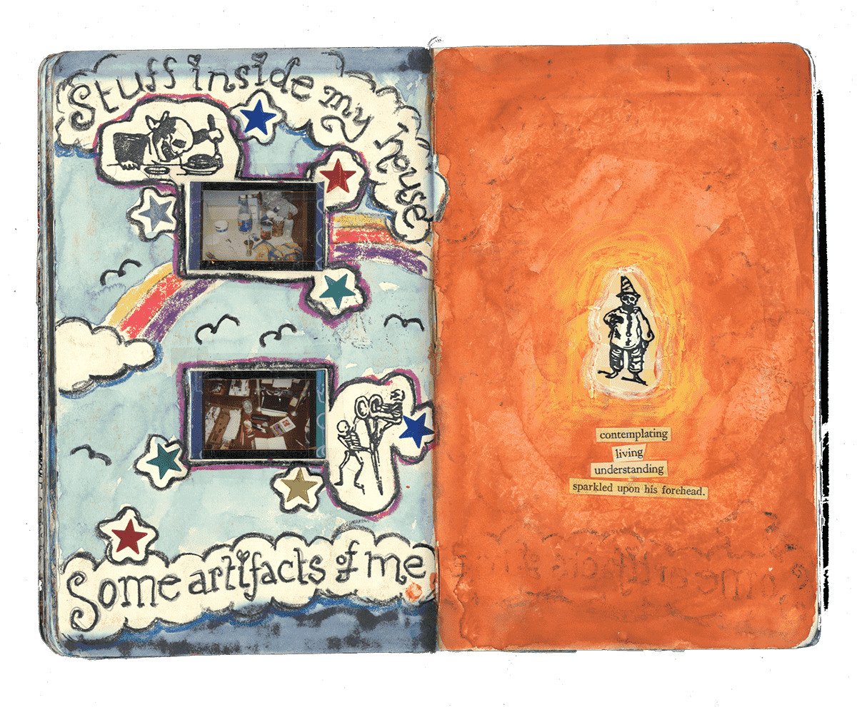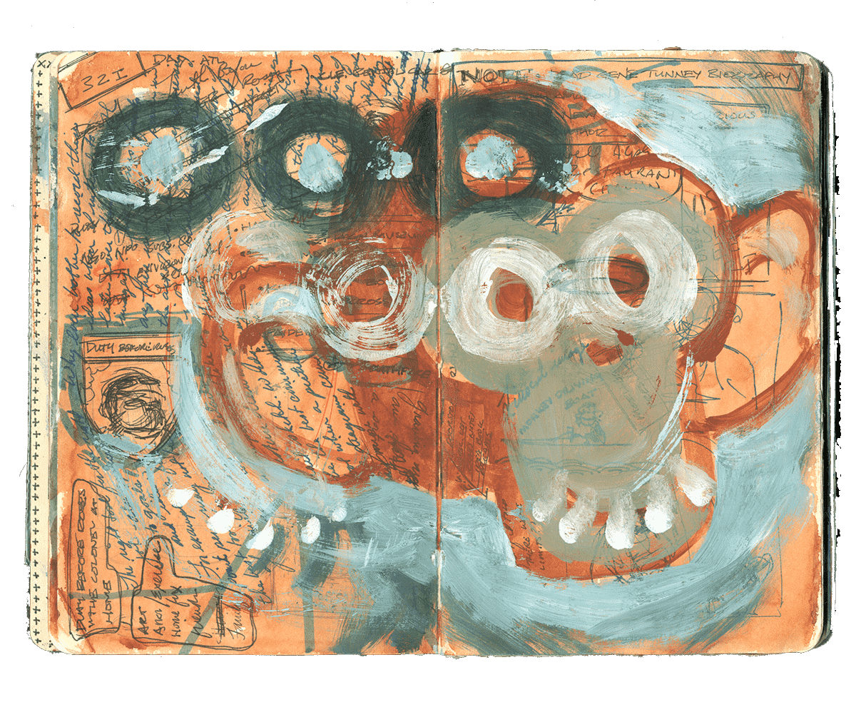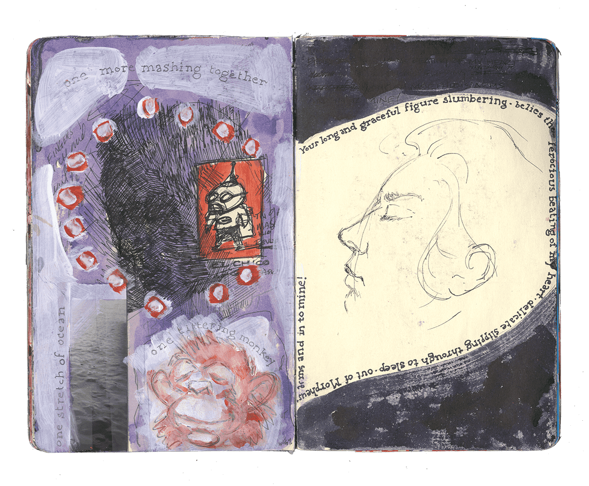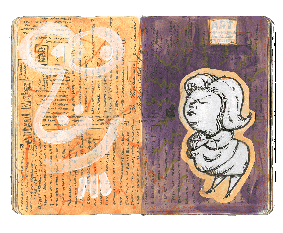 Many of the creations are housed in sketchbooks, kept assiduously over four decades. The Host, laboring under the illusion that the creations were his own, totes the books wherever he goes, recording what he sees and hears and feels—both outside and within. Furiously he scribbles and suffers, effuses and elates.