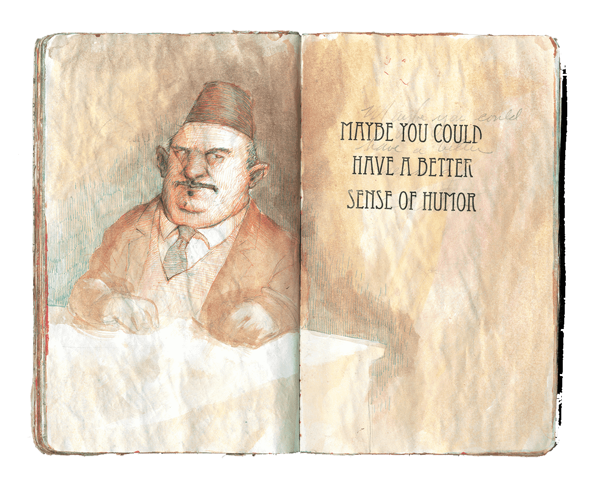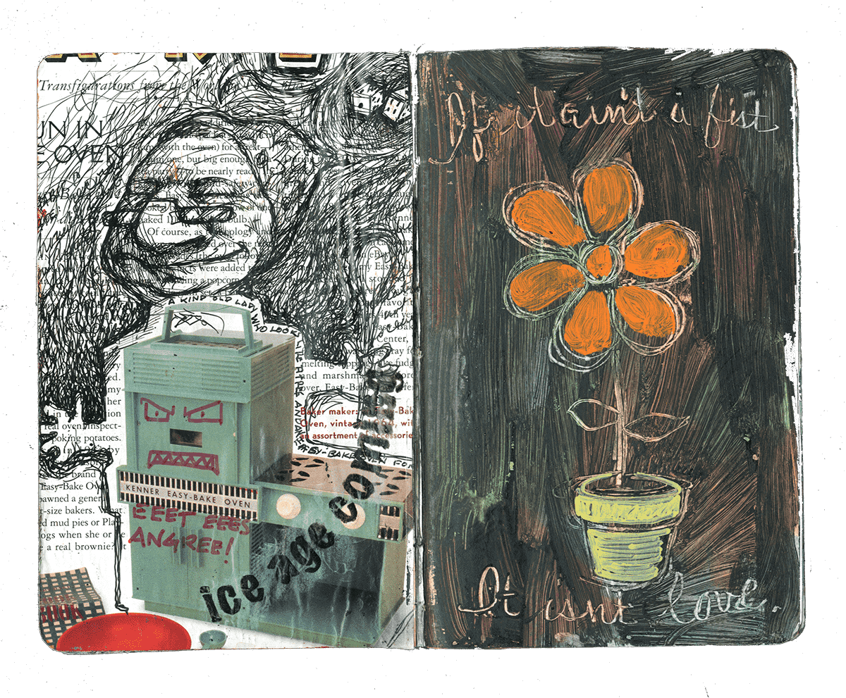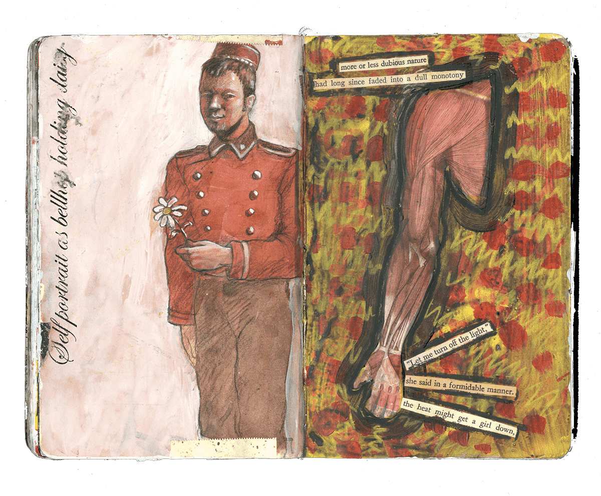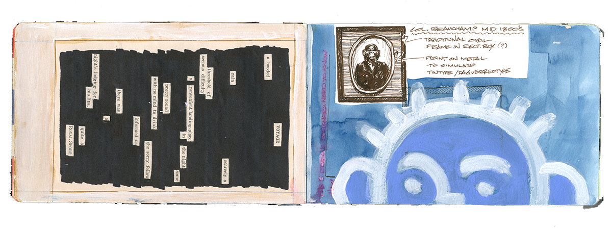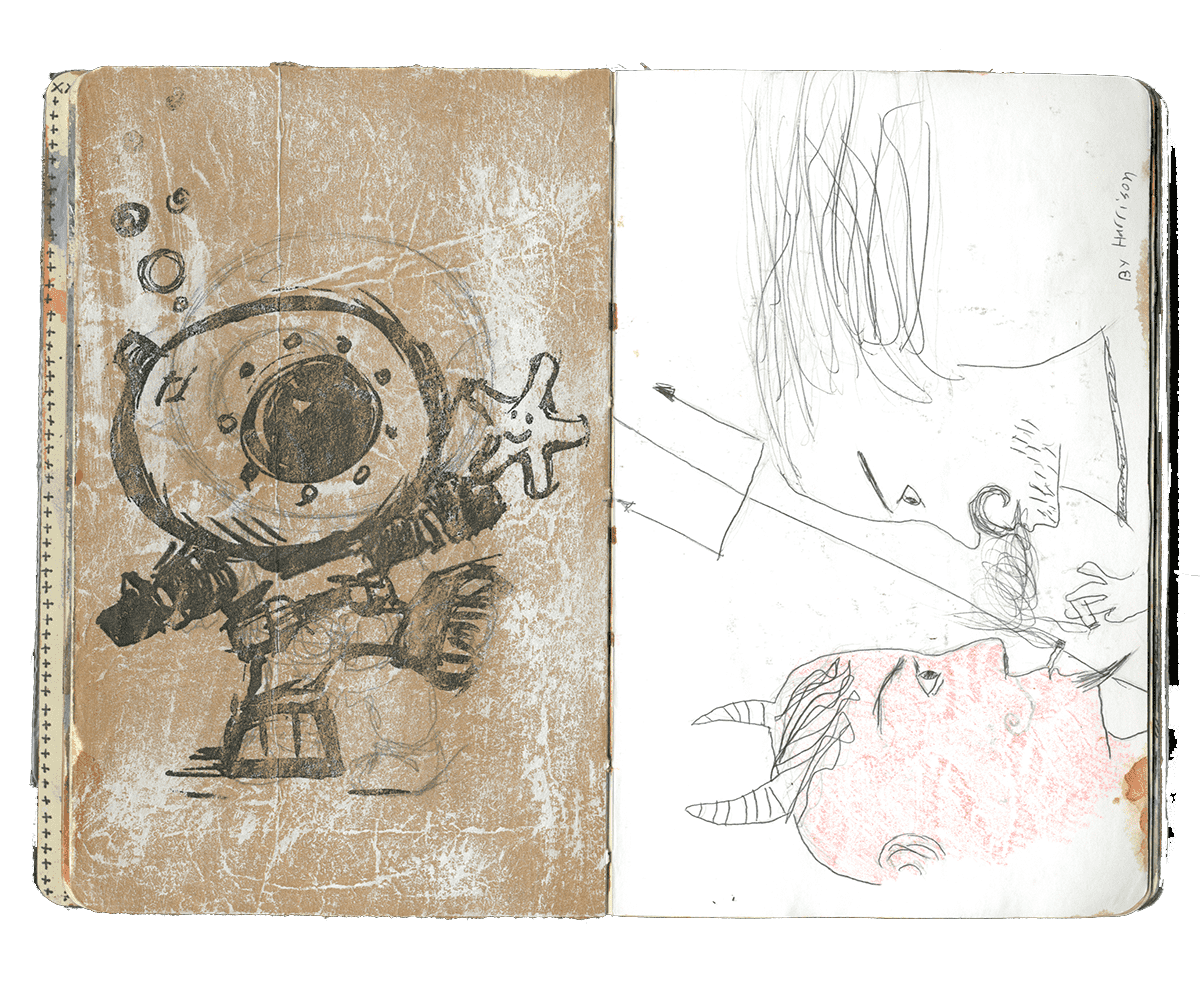 Many of the creations are housed in sketchbooks, kept assiduously over four decades. The Host, laboring under the illusion that the creations were his own, totes the books wherever he goes, recording what he sees and hears and feels—both outside and within. Furiously he scribbles and suffers, effuses and elates.