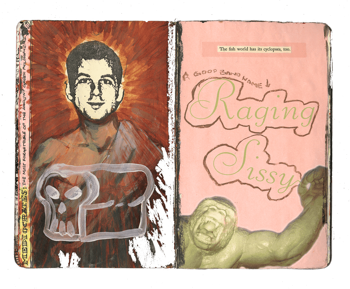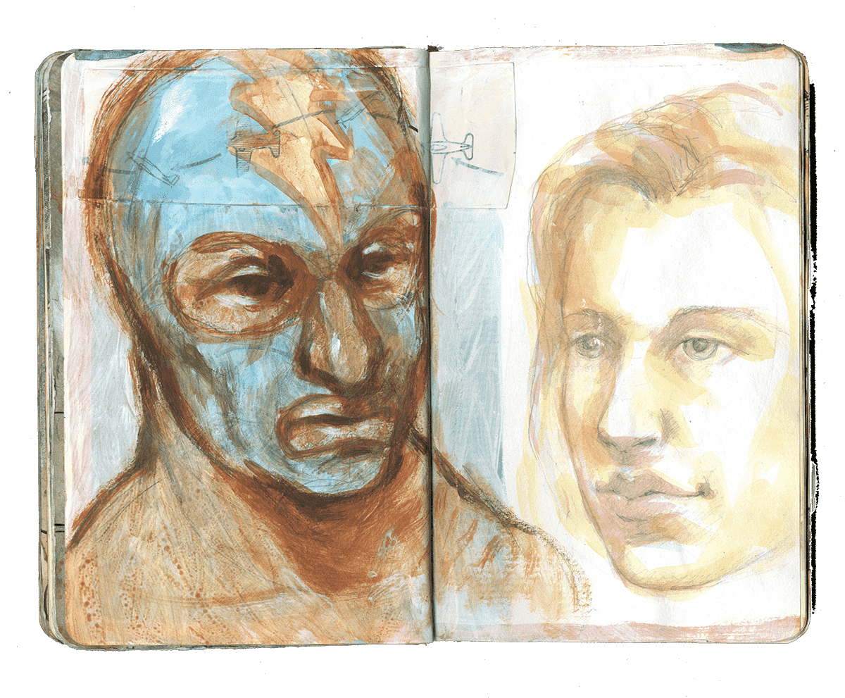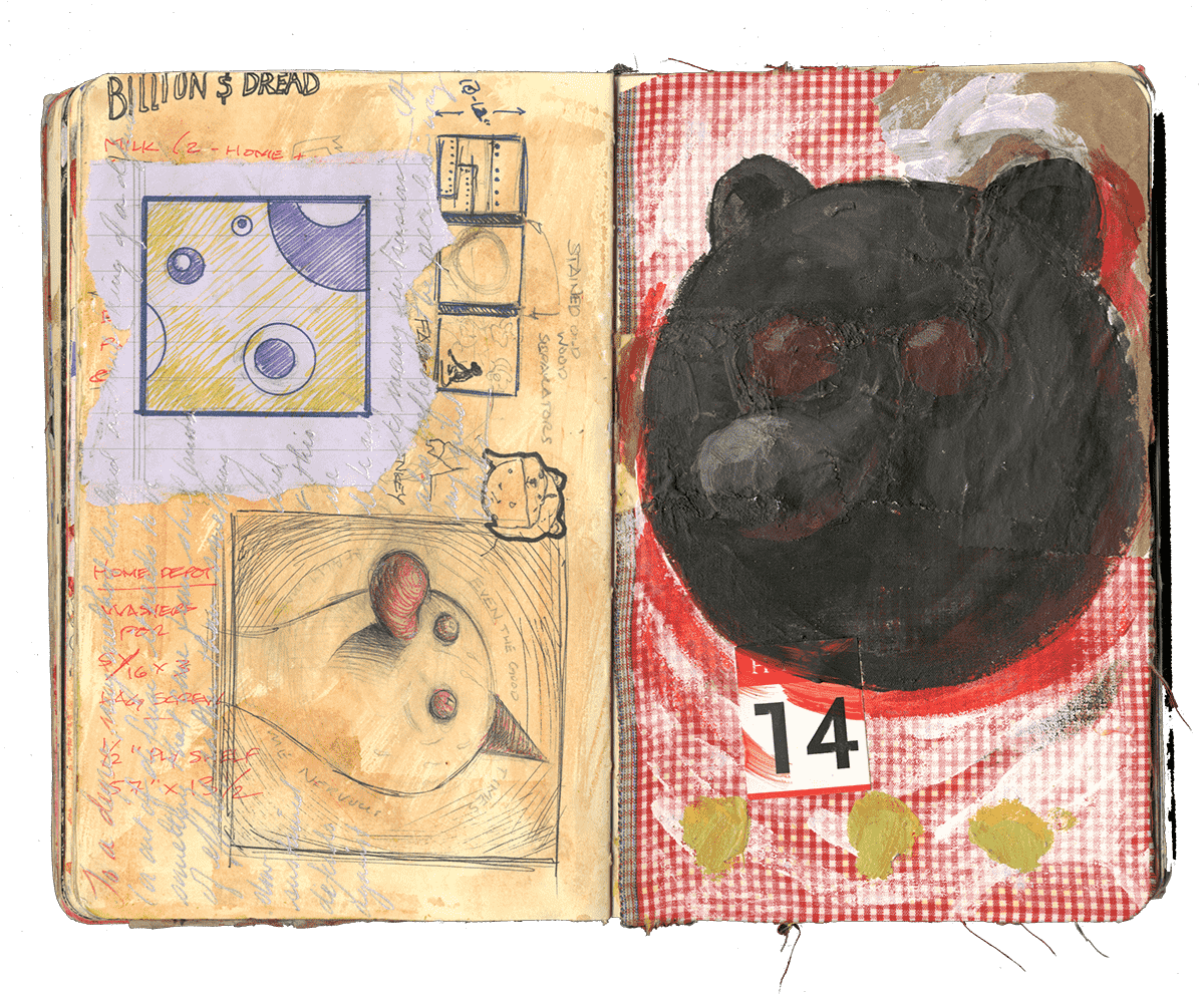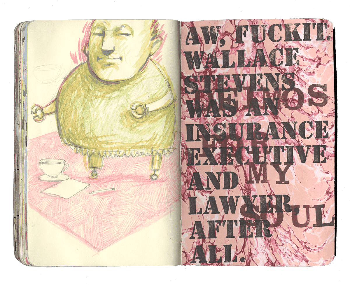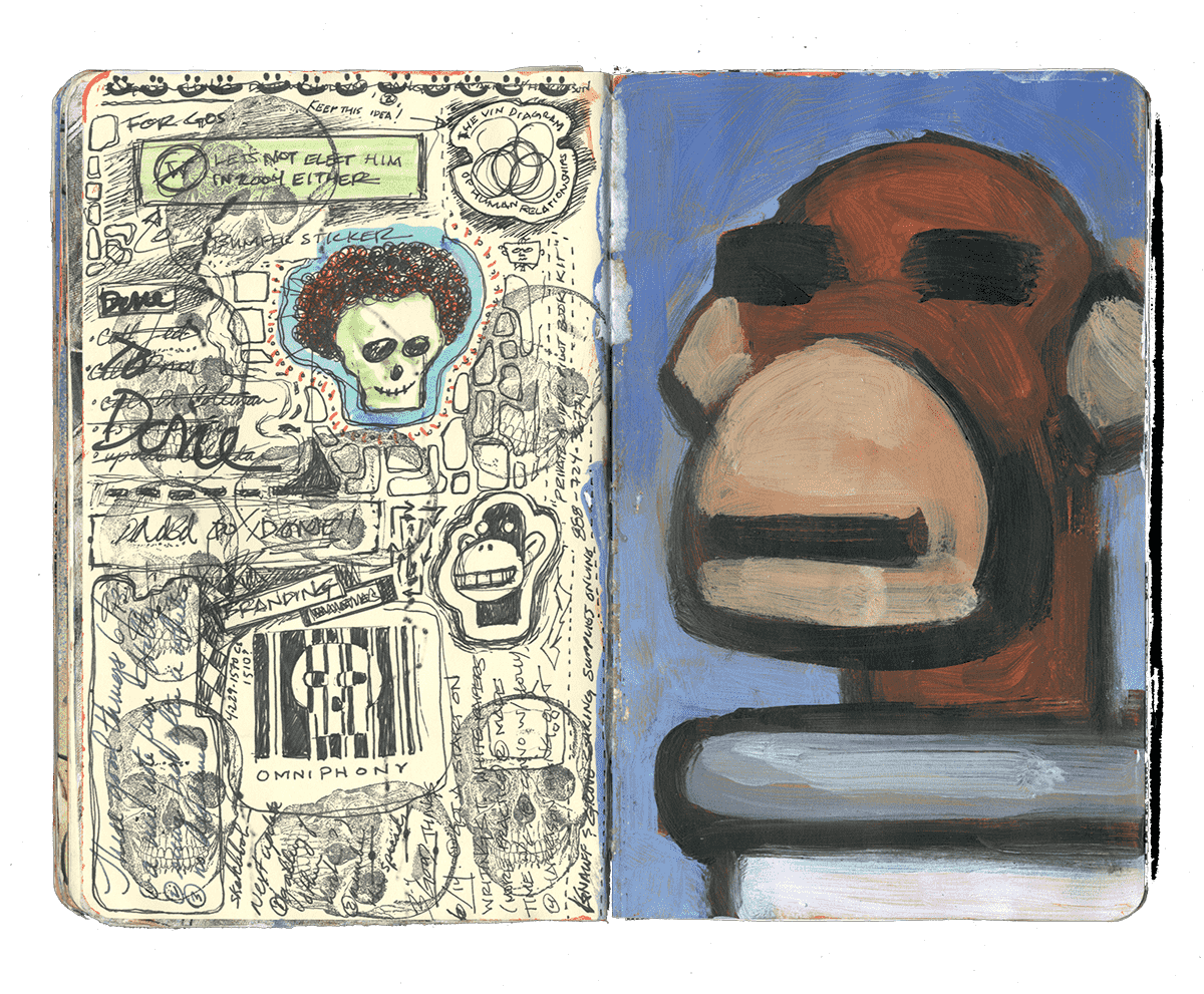 Many of the creations are housed in sketchbooks, kept assiduously over four decades. The Host, laboring under the illusion that the creations were his own, totes the books wherever he goes, recording what he sees and hears and feels—both outside and within. Furiously he scribbles and suffers, effuses and elates.