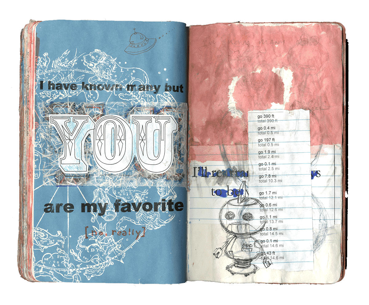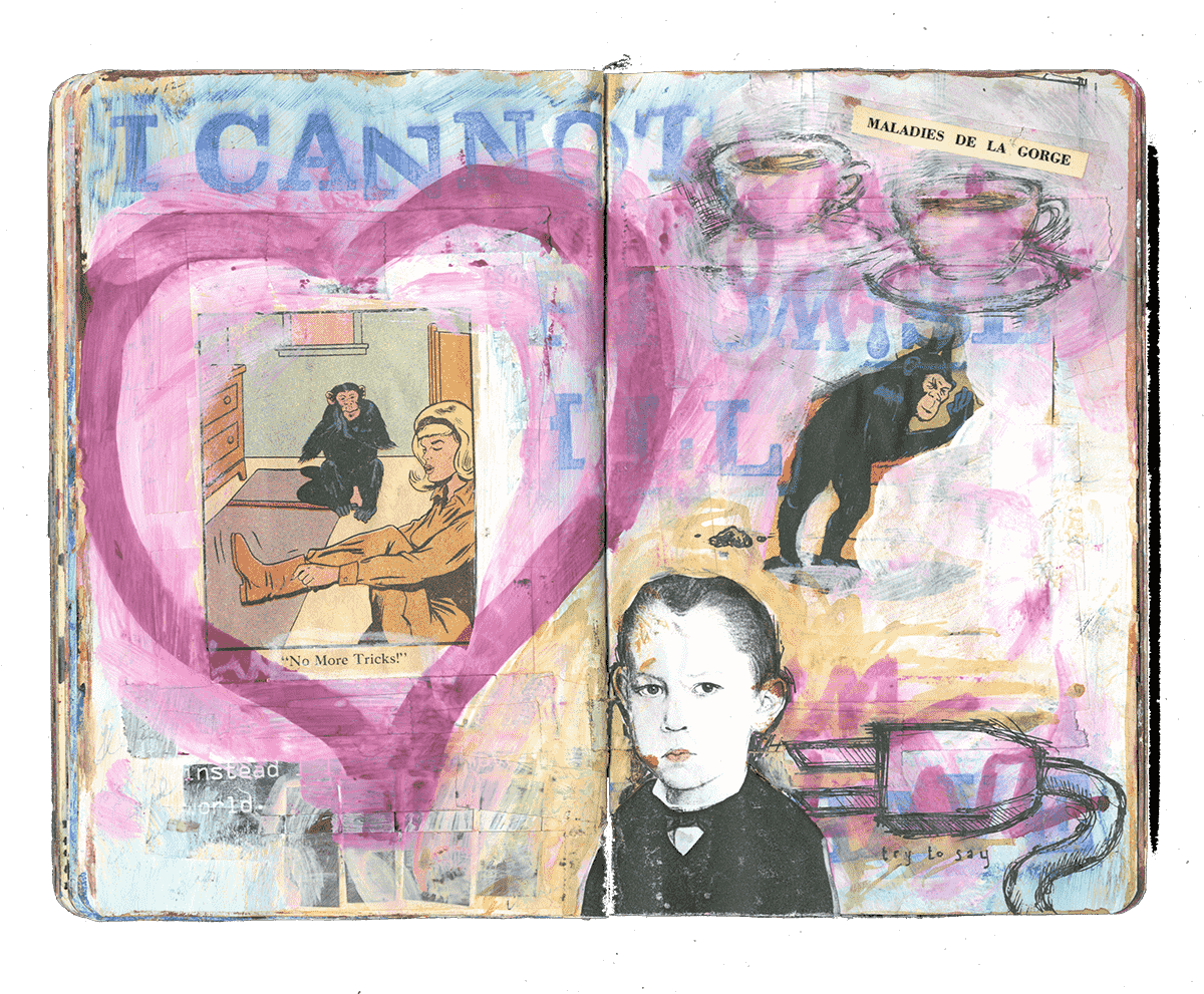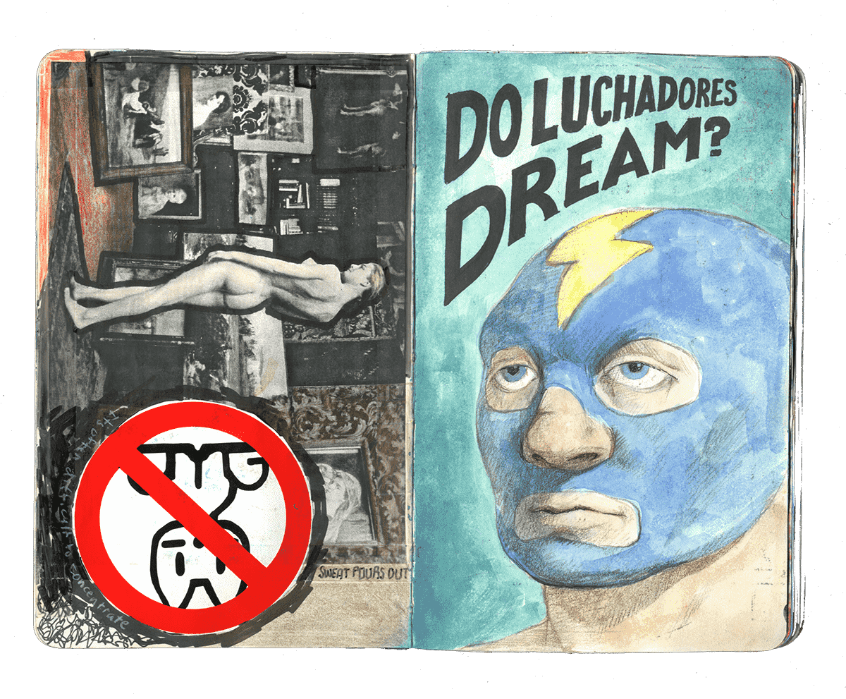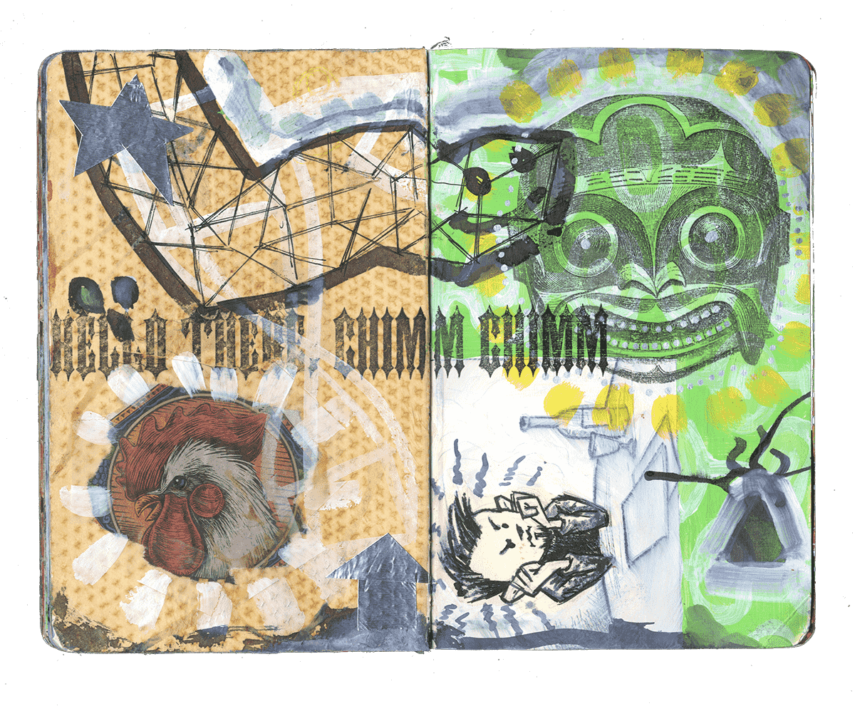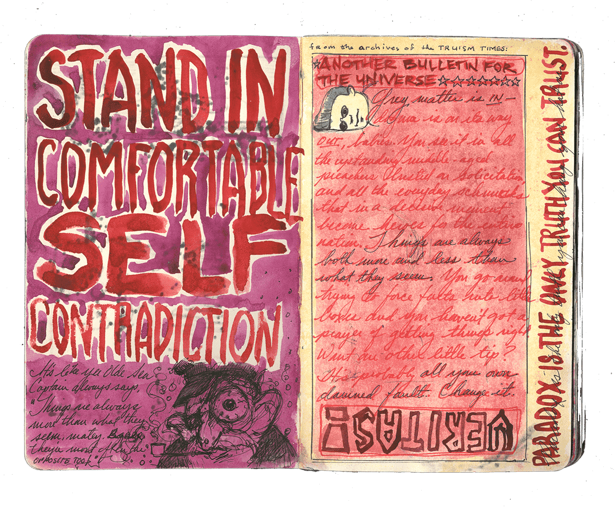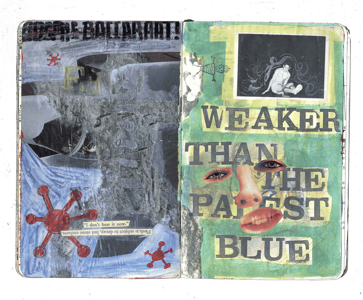 Many of the creations are housed in sketchbooks, kept assiduously over four decades. The Host, laboring under the illusion that the creations were his own, totes the books wherever he goes, recording what he sees and hears and feels—both outside and within. Furiously he scribbles and suffers, effuses and elates.