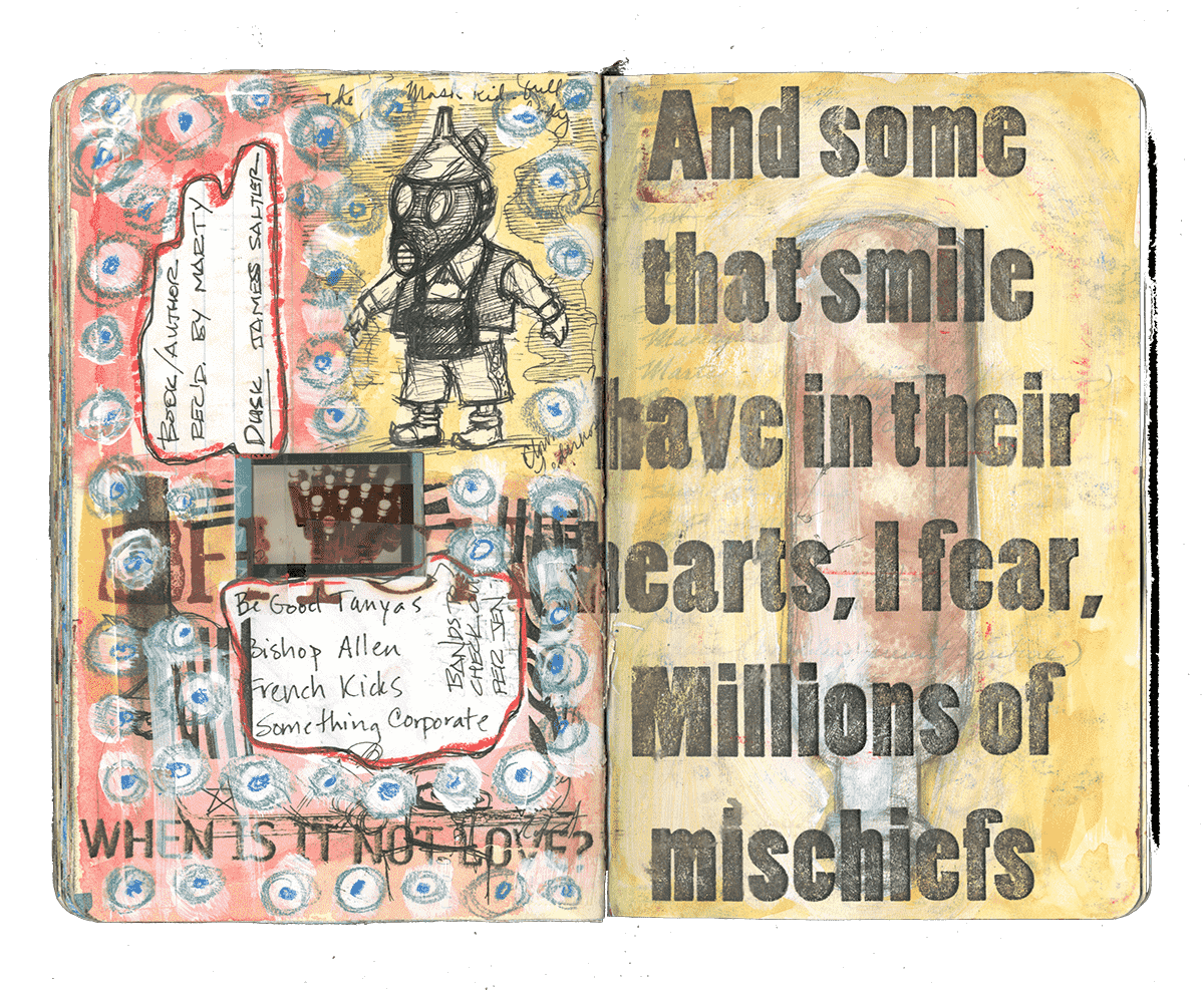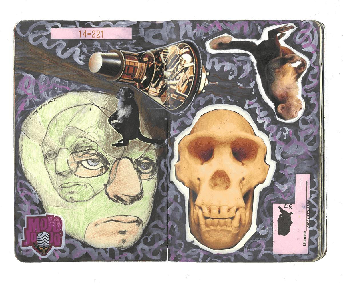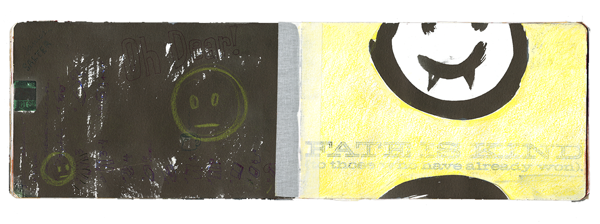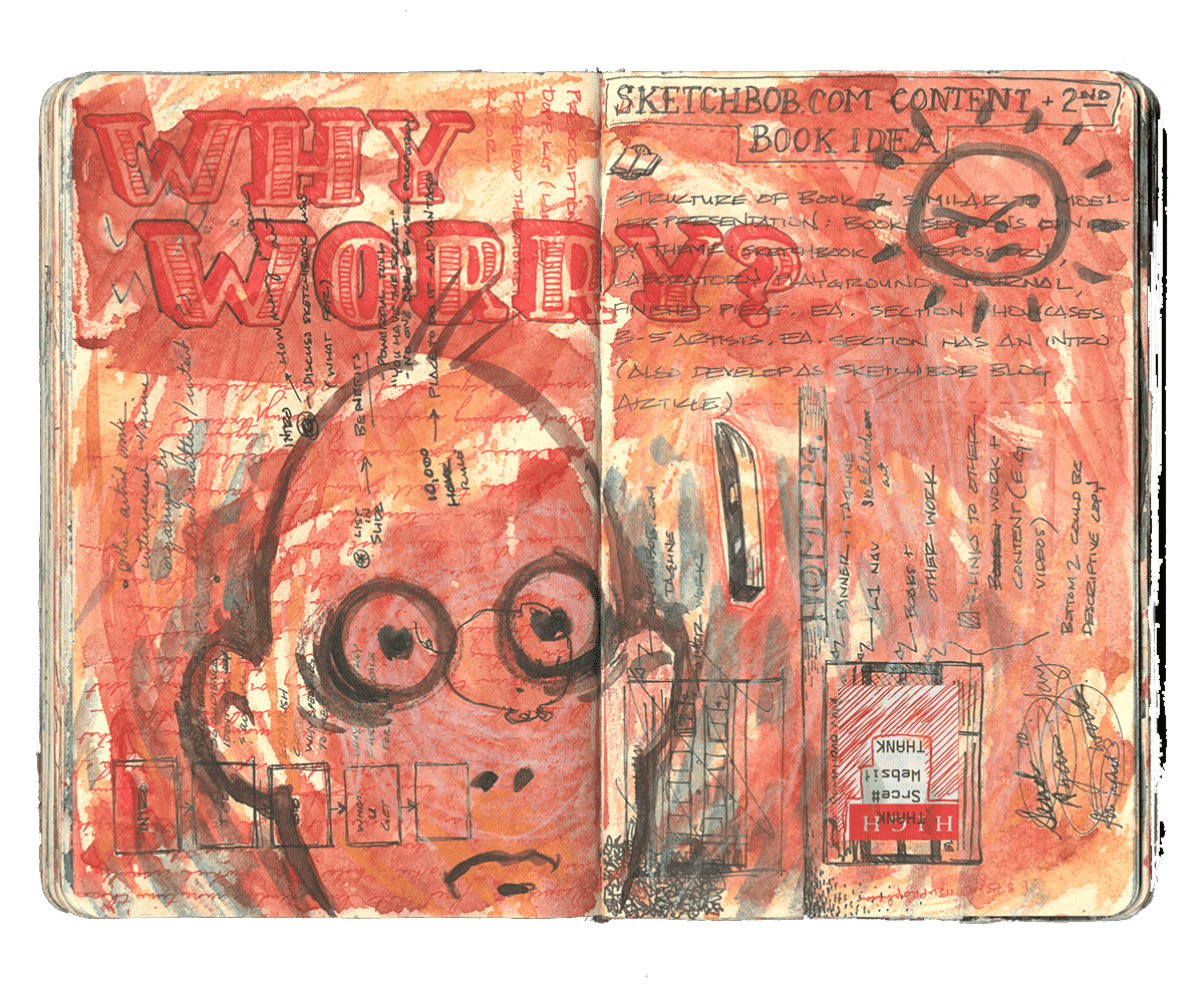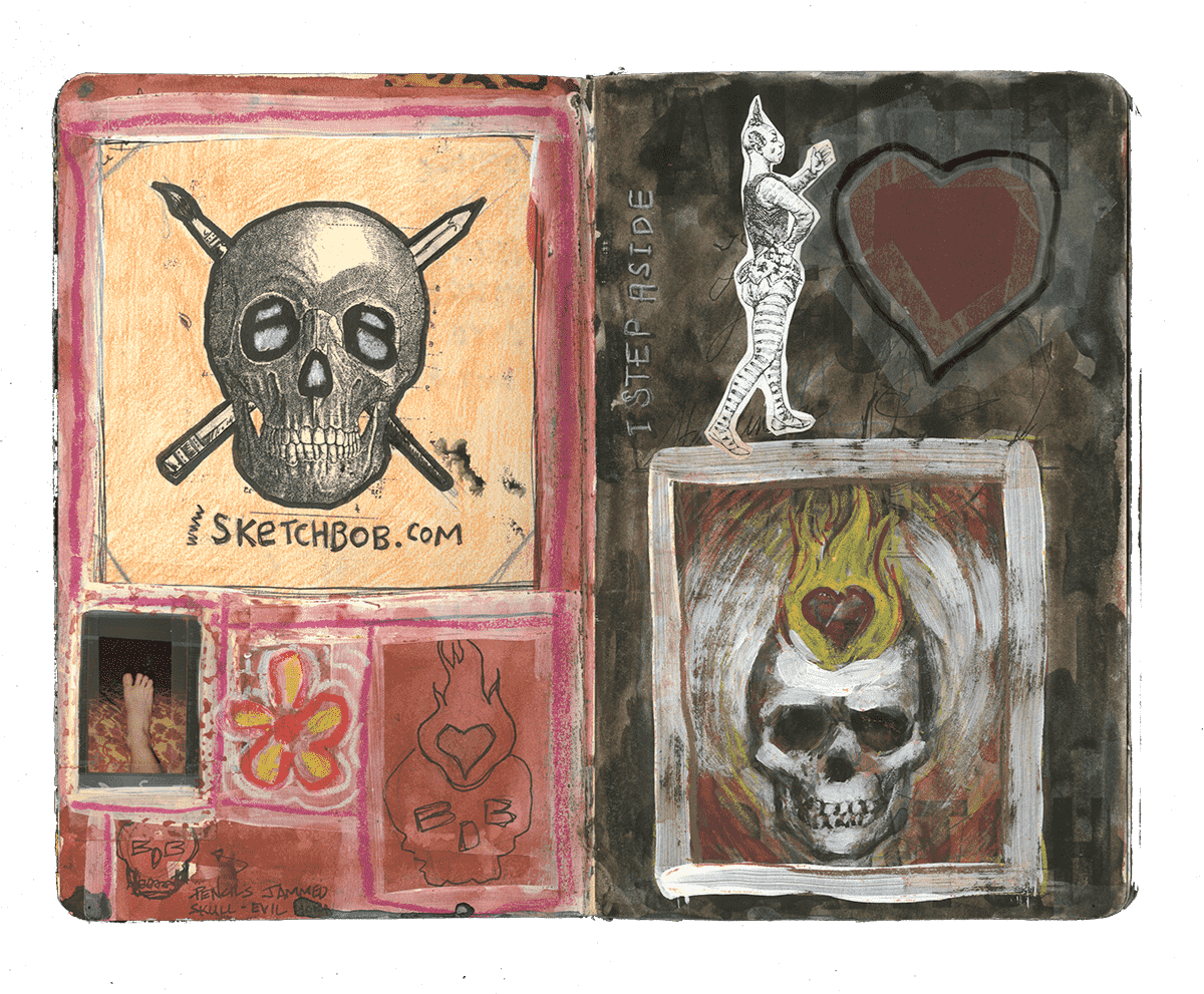 Many of the creations are housed in sketchbooks, kept assiduously over four decades. The Host, laboring under the illusion that the creations were his own, totes the books wherever he goes, recording what he sees and hears and feels—both outside and within. Furiously he scribbles and suffers, effuses and elates.