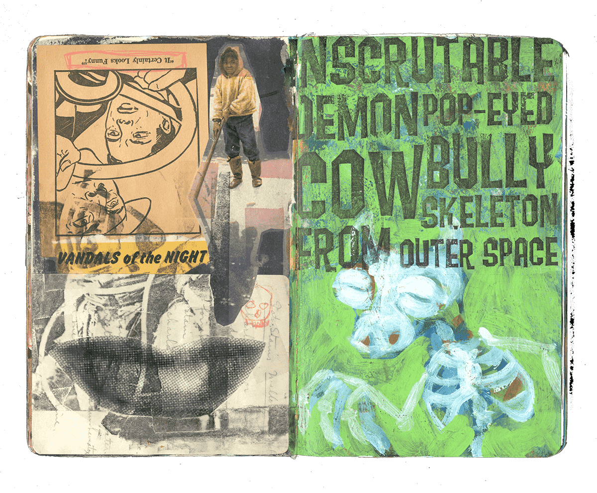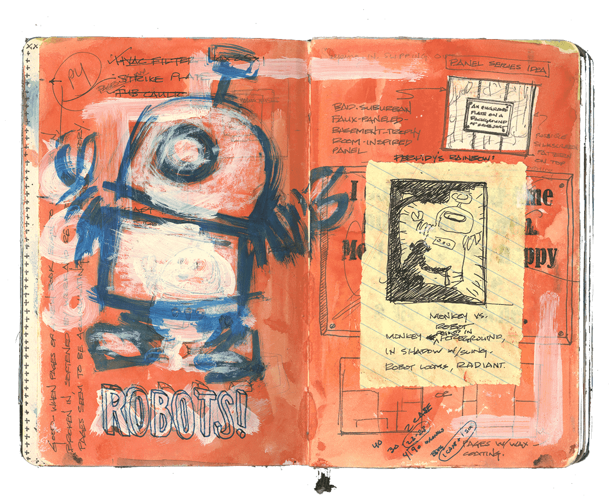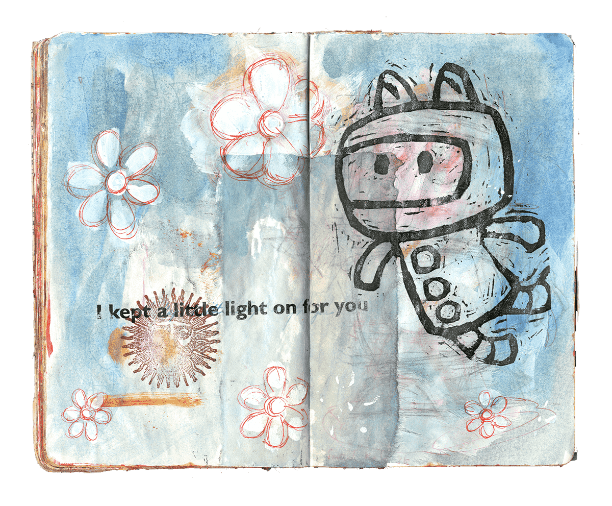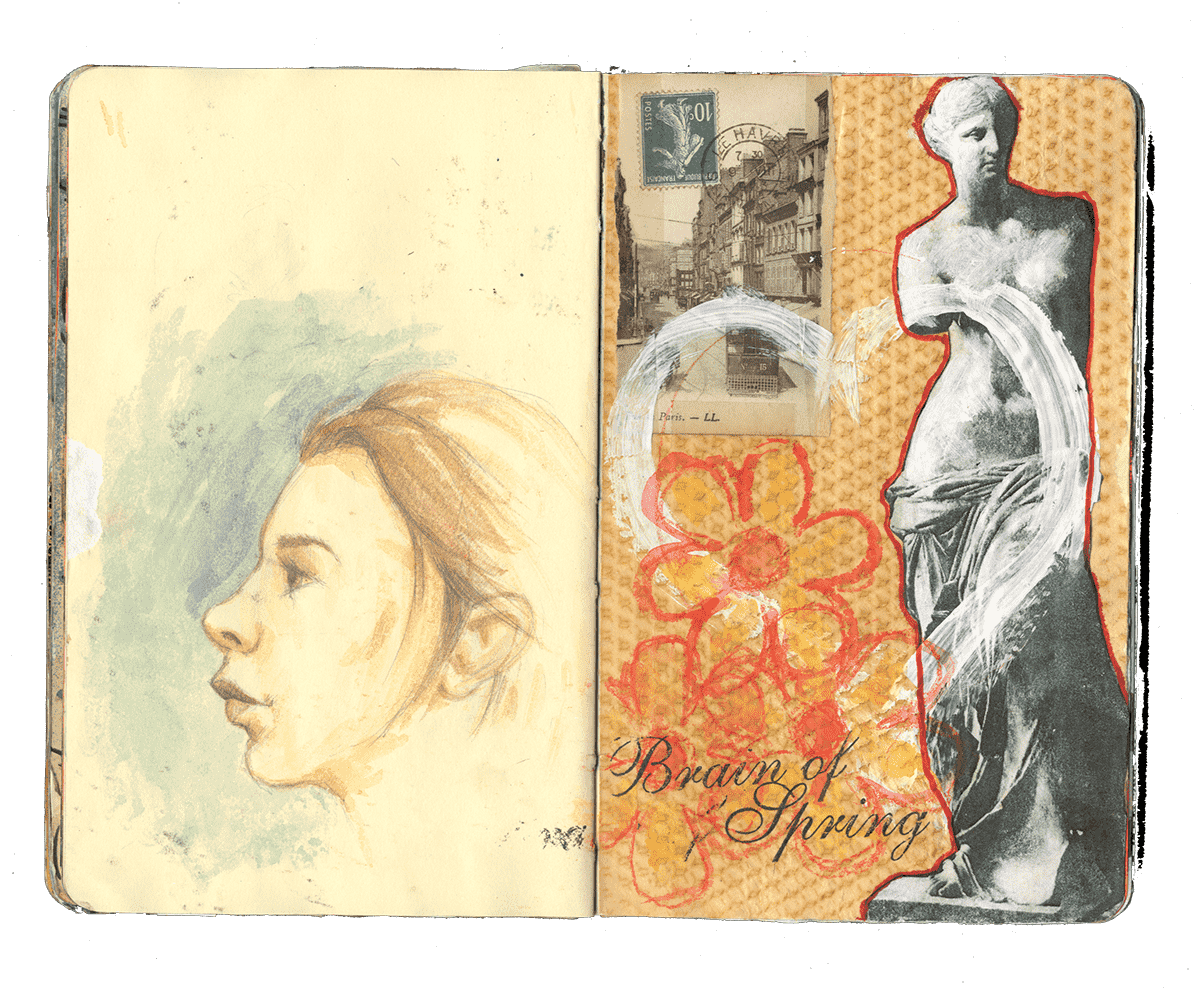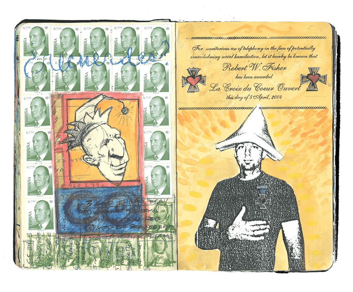 Many of the creations are housed in sketchbooks, kept assiduously over four decades. The Host, laboring under the illusion that the creations were his own, totes the books wherever he goes, recording what he sees and hears and feels—both outside and within. Furiously he scribbles and suffers, effuses and elates.