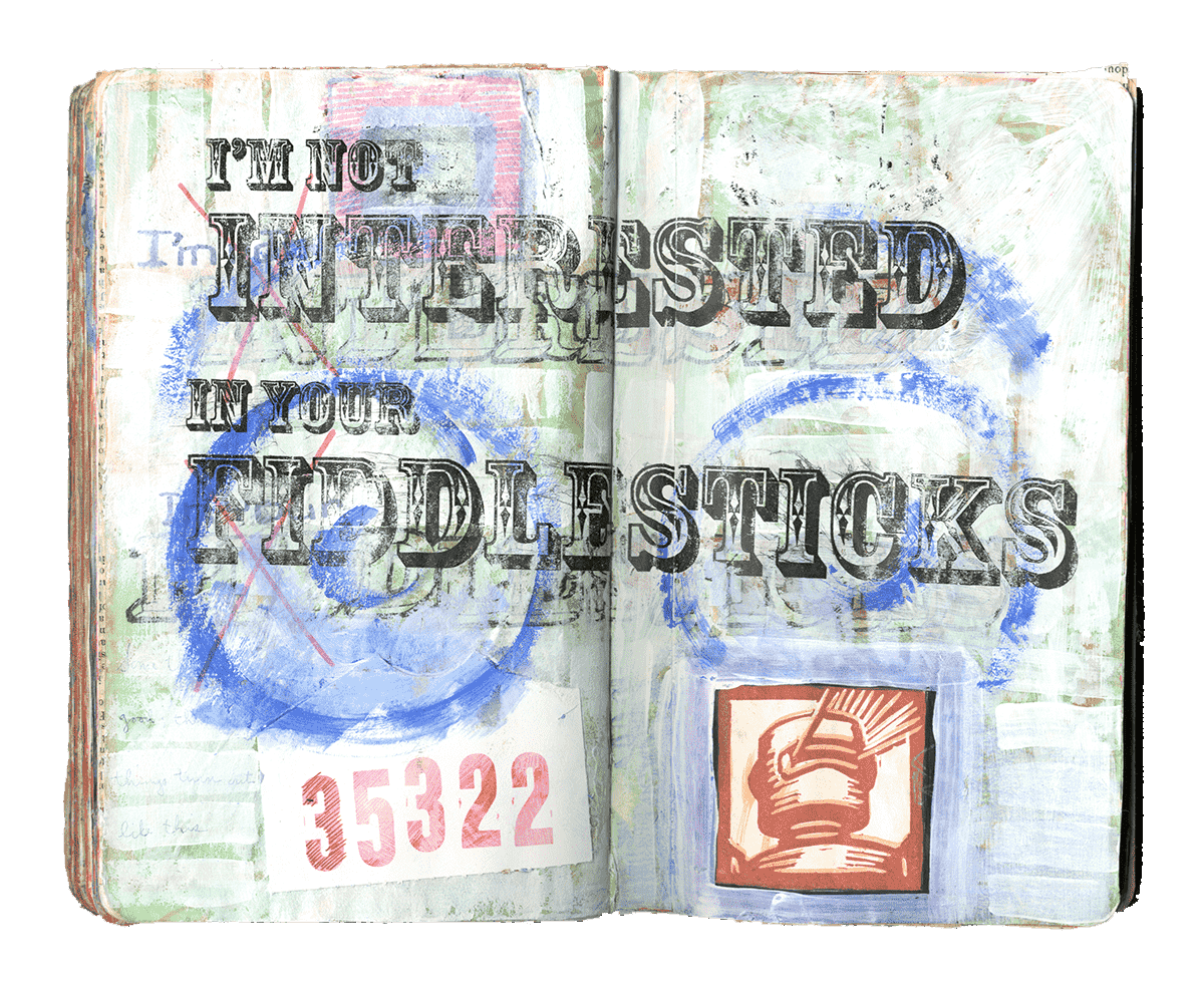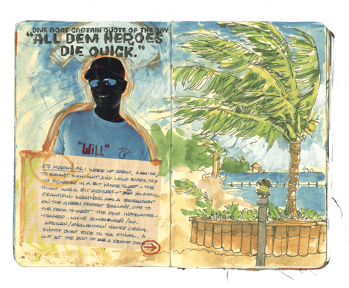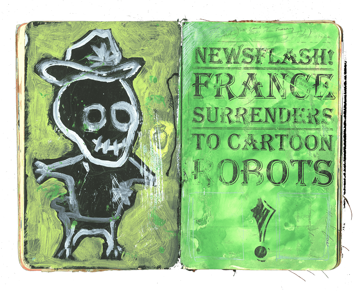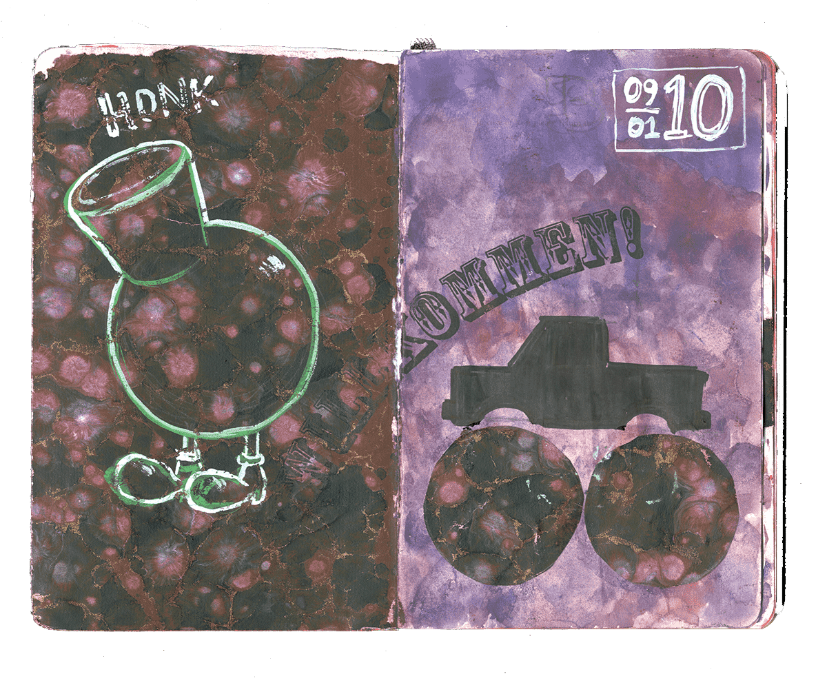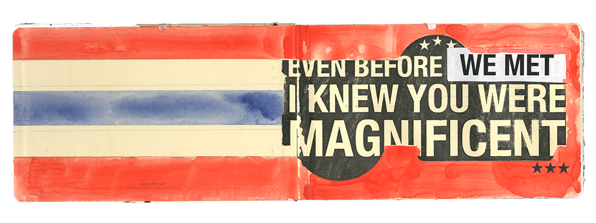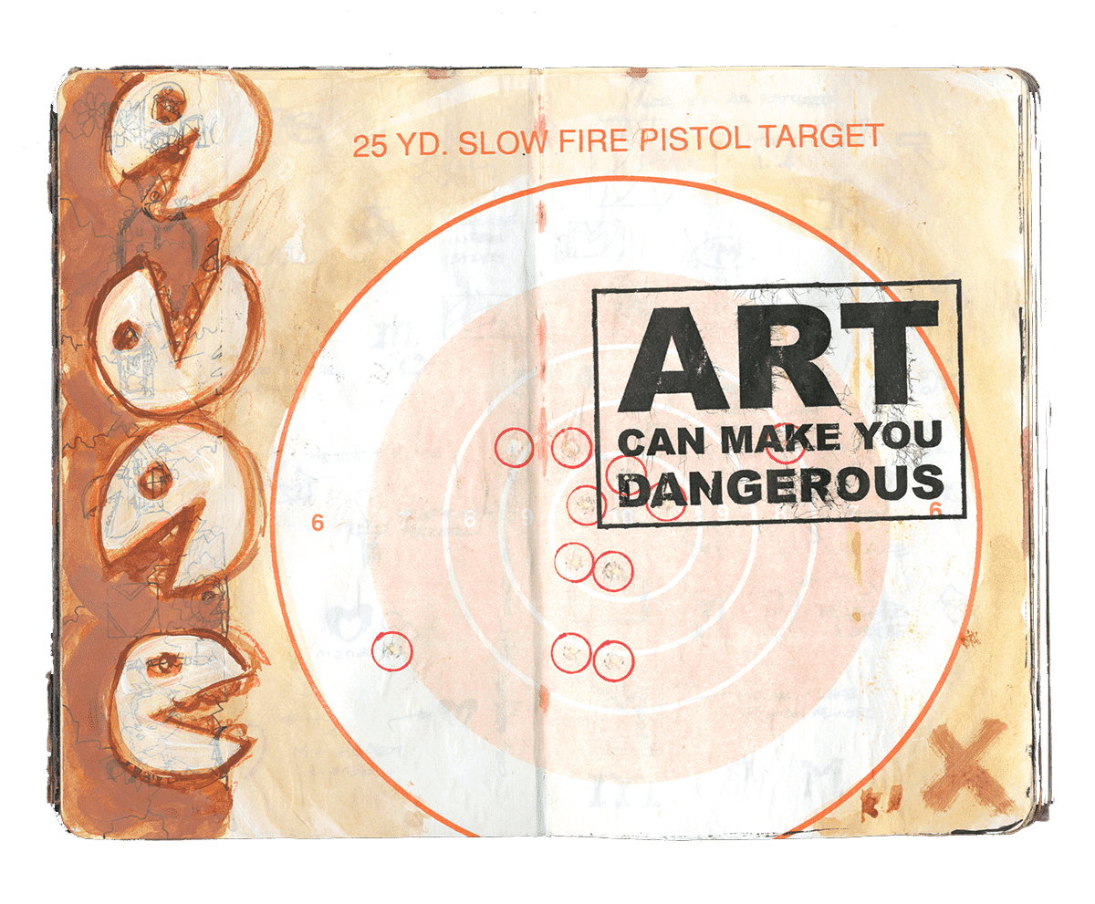 Many of the creations are housed in sketchbooks, kept assiduously over four decades. The Host, laboring under the illusion that the creations were his own, totes the books wherever he goes, recording what he sees and hears and feels—both outside and within. Furiously he scribbles and suffers, effuses and elates.